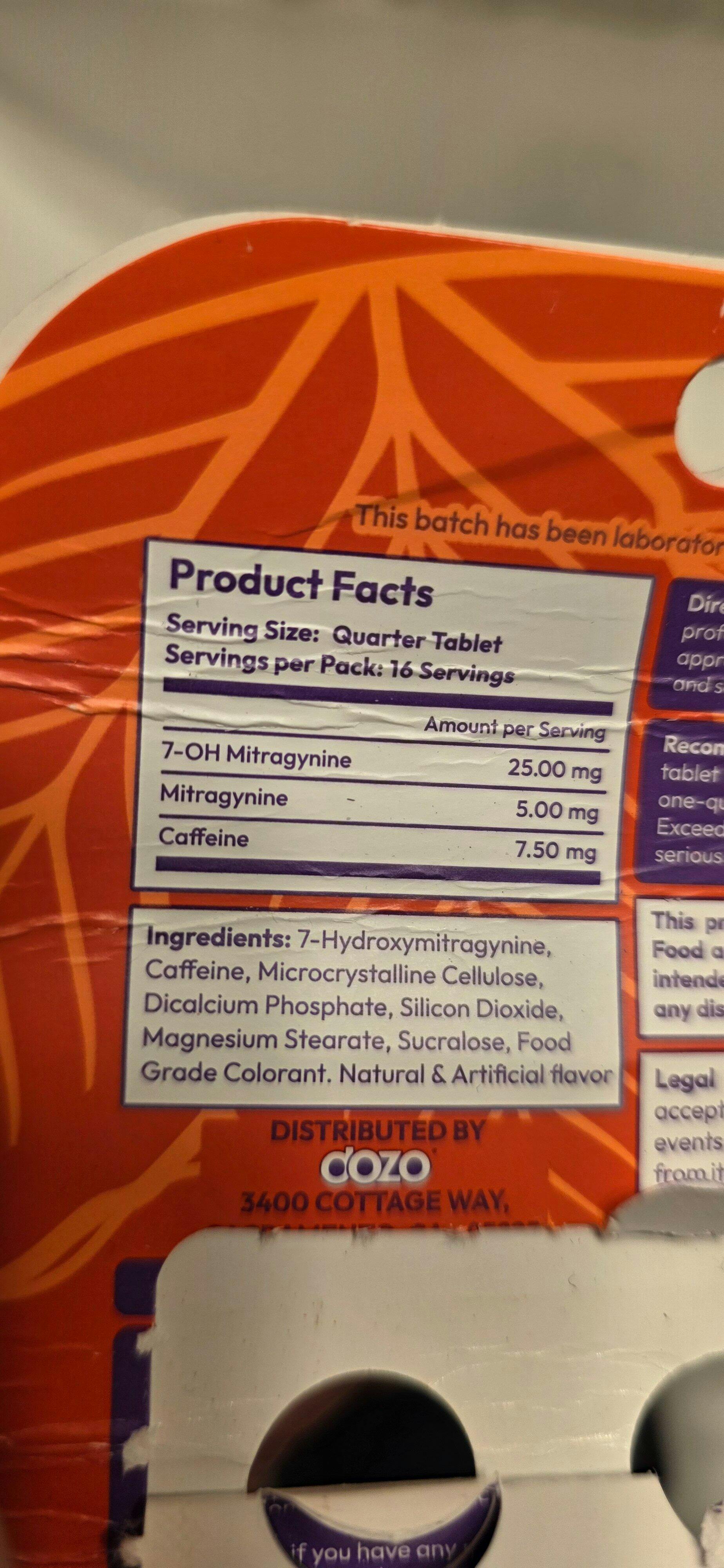WARNING: This product contains 7-Hydroxymitragynine (7-OH) and should always be used responsibly and only as directed. Keep Out of Reach of Children. This product is not intended to diagnose, treat, cure, or prevent any medical condition or disease and may be harmful to your health. FDA has not approved 7OH for therapeutic uses. Consult a health provider for questions regarding 7OH use. Do not use this product: (1) if the product is damaged or has been opened prior to use; (2) in combination with any psychoactive, intoxicating or impairing substance including other botanical products , alcohol, nicotine, cannabinoids, or illicit substances; (3) if you have health conditions (including but not limited to any heart or liver disease or disorder, or high blood pressure) or use prescription medicine, over-the-counter drugs or dietary supplements except under physician supervision; (4) if you are pregnant, may become pregnant, or are breastfeeding; or (5) before engaging in dangerous activities, operating machinery or operating a motor vehicle. This product is not intended to be used or sold as an alternative to alcohol, nicotine, cannabinoids, prescription medications, or any other substance. This product is not intended to be used or sold for the treatment of any disease, illness or injury for which physician care should be sought. 7OH may be habit forming. If you struggle with addiction or dependency or have questions regarding 7OH, consult a physician before using this product. If you experience any adverse effects from using this product, seek immediate medical attention.